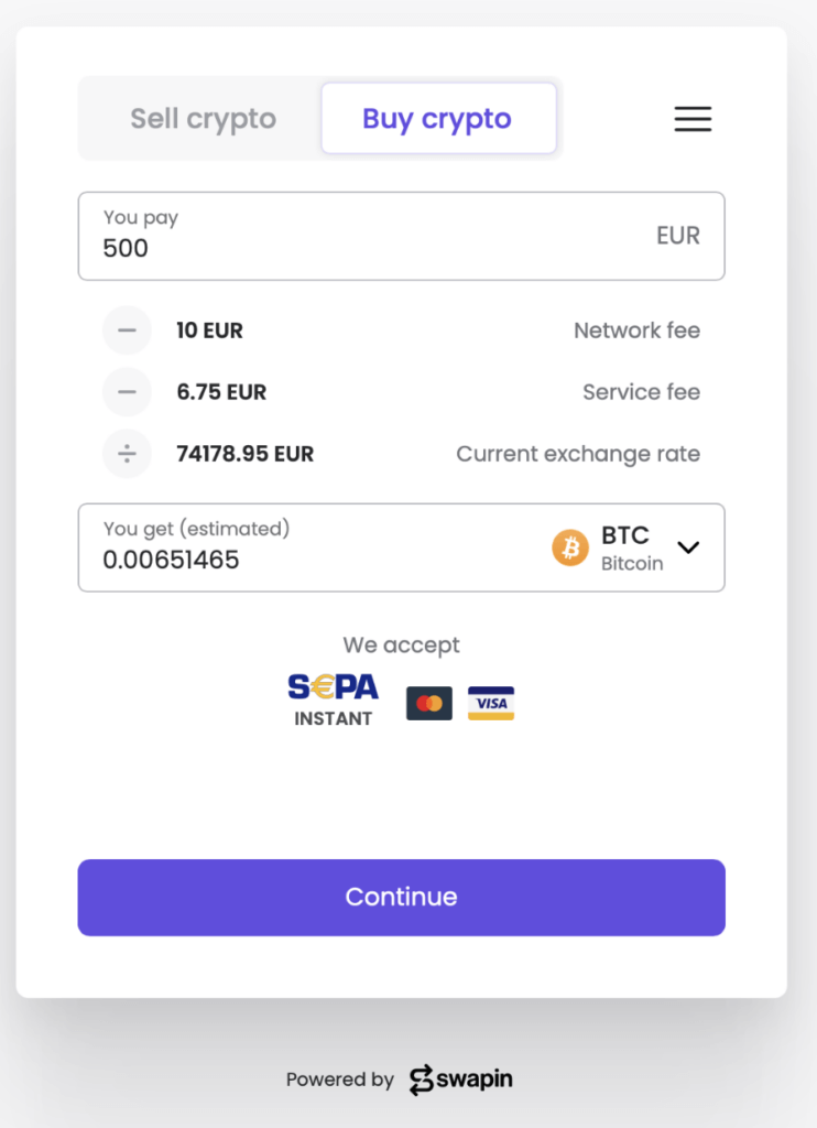 After the fiat funds are received, they are automatically converted into cryptocurrency and sent to the specified wallet address. If the customer’s bank supports instant SEPA transfers, the transaction can be completed within minutes.